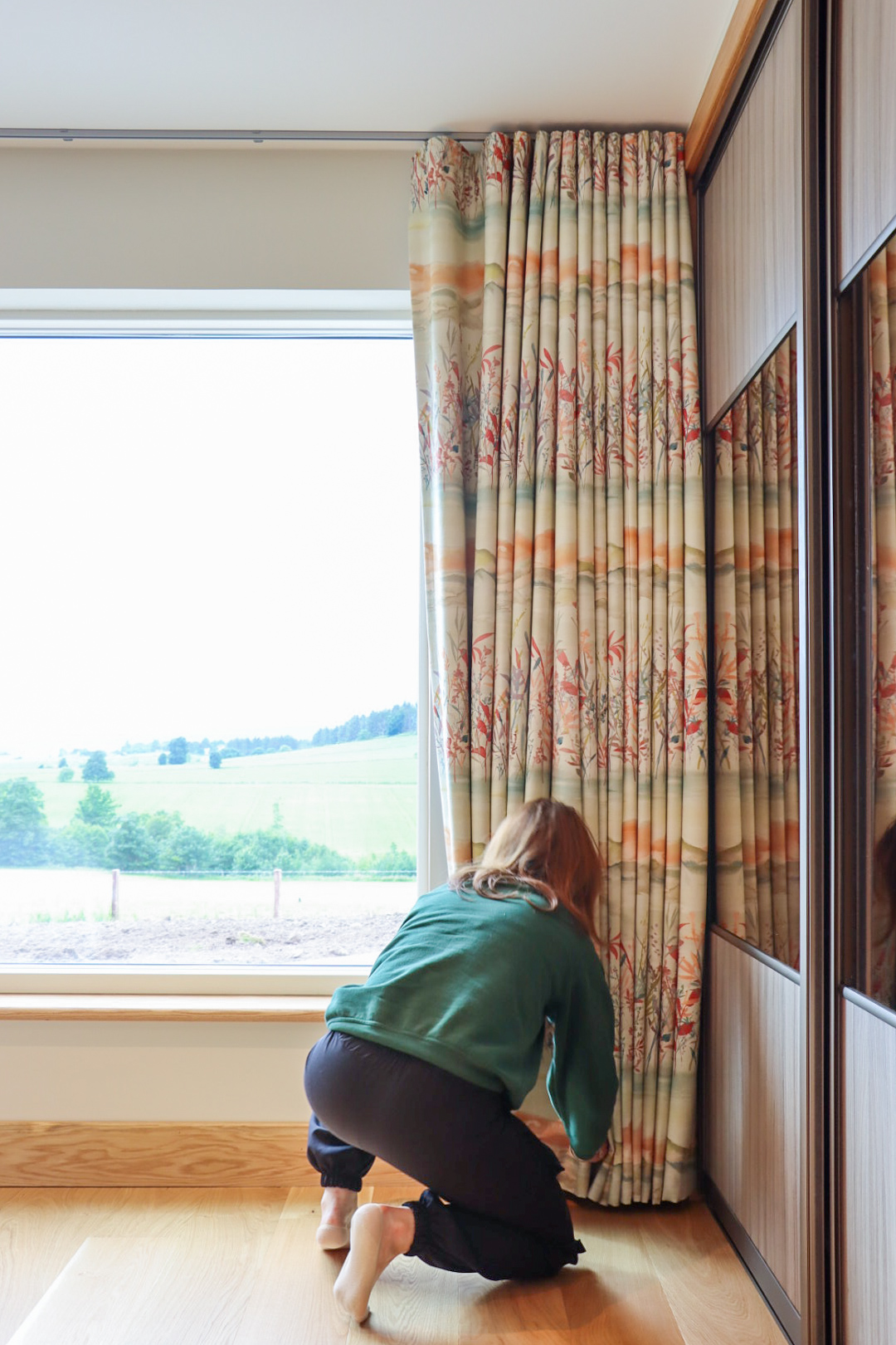 Master bedroom – The master bedroom features an Iliv fabric from the Water Meadow collection, adding warmth, peace, and a pop of fun color to the room. To make the most of the large window, we chose to install wall-to-wall, floor-to-ceiling padded blackout curtains with a 3″ wave heading. This setup not only frames the room beautifully but also creates a cosy ambiance.